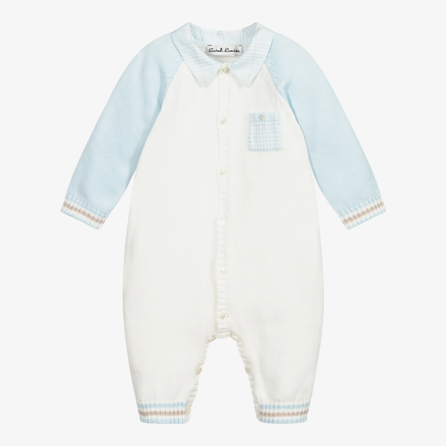 Ivory and pale blue romper for baby boys, by Sarah Louise. Made from soft knitted cotton, it has a sweet pale blue and white houndstooth print pocket on the front, collar, and beige striped cuffs.