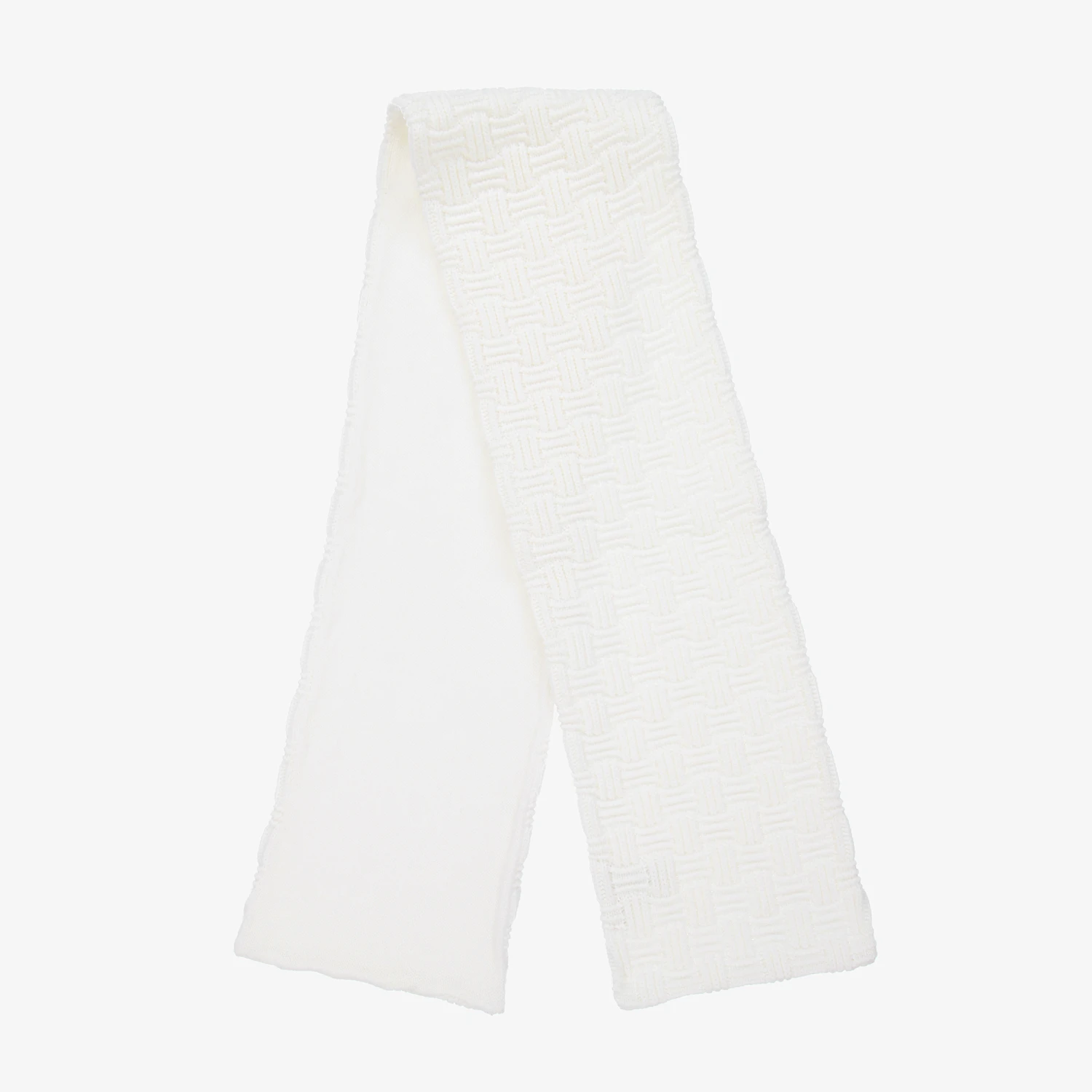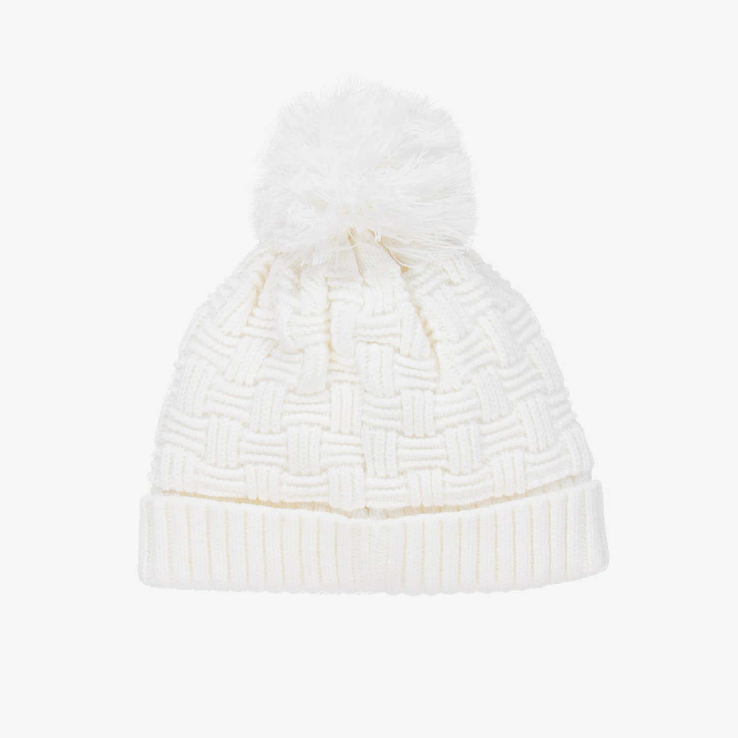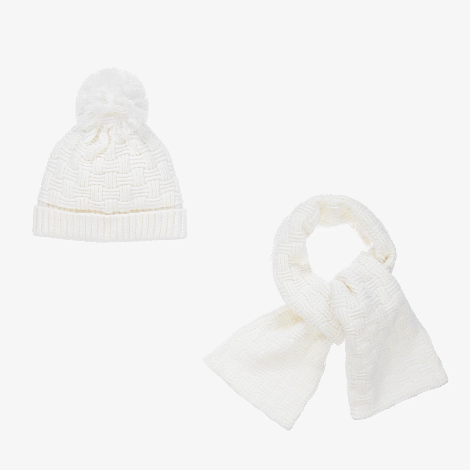 Ivory hat and scarf set for boys and girls by British brand Sarah Louise, in a soft, chunky knit. Both pieces have a pretty basket weave stitch and a lightweight knitted lining. The hat has a ribbed, turn-up brim and a fluffy pom-pom on the top.