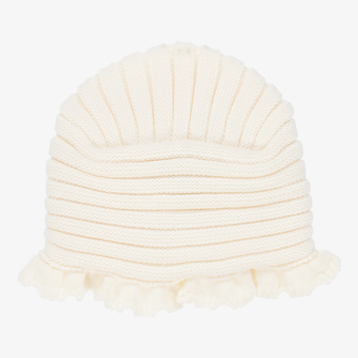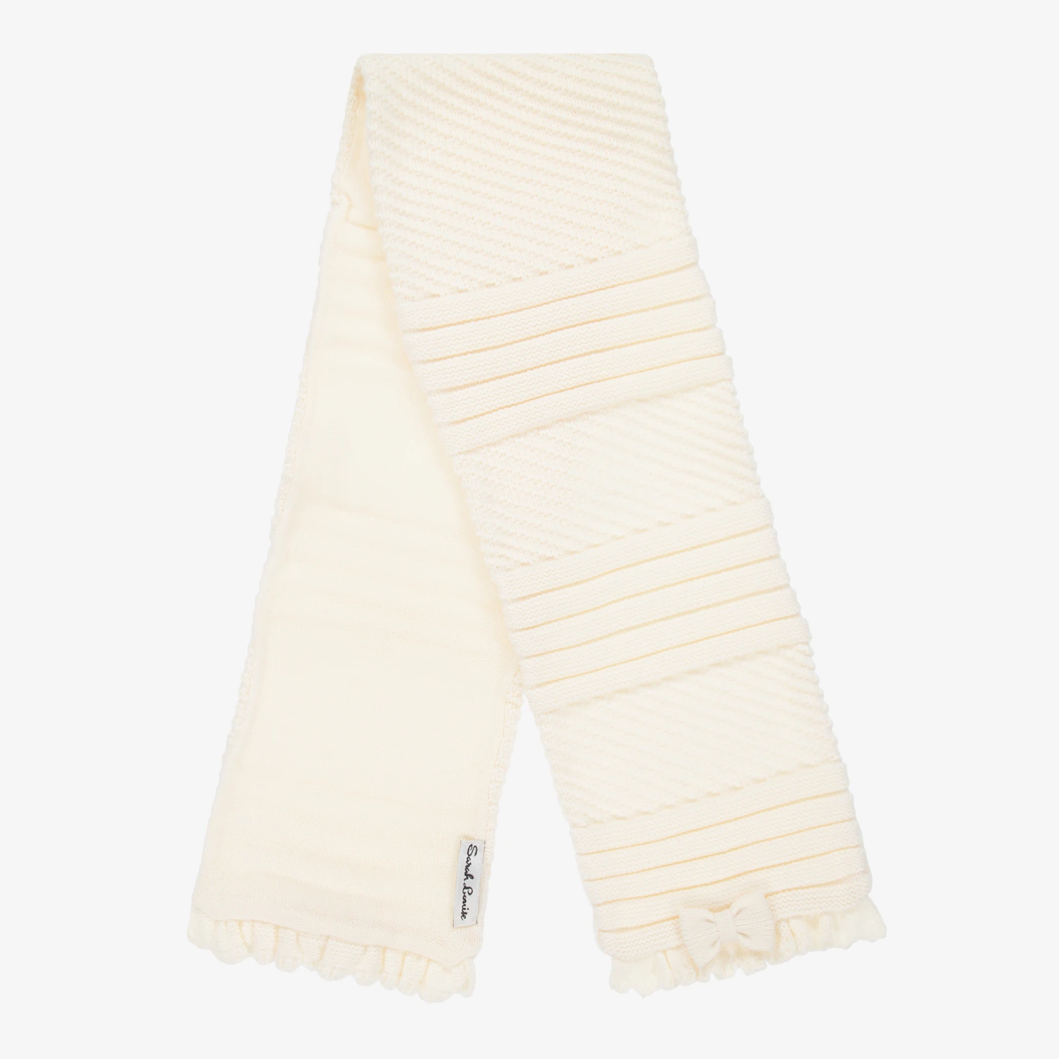 Ivory knitted hat and scarf set for little girls, by Sarah Louise. Made from a soft acrylic knit, the scarf has gorgeous raised ribbing details with a bow and ruffle trim at each end. The hat has a cute bow on the front with a ruffle trim.