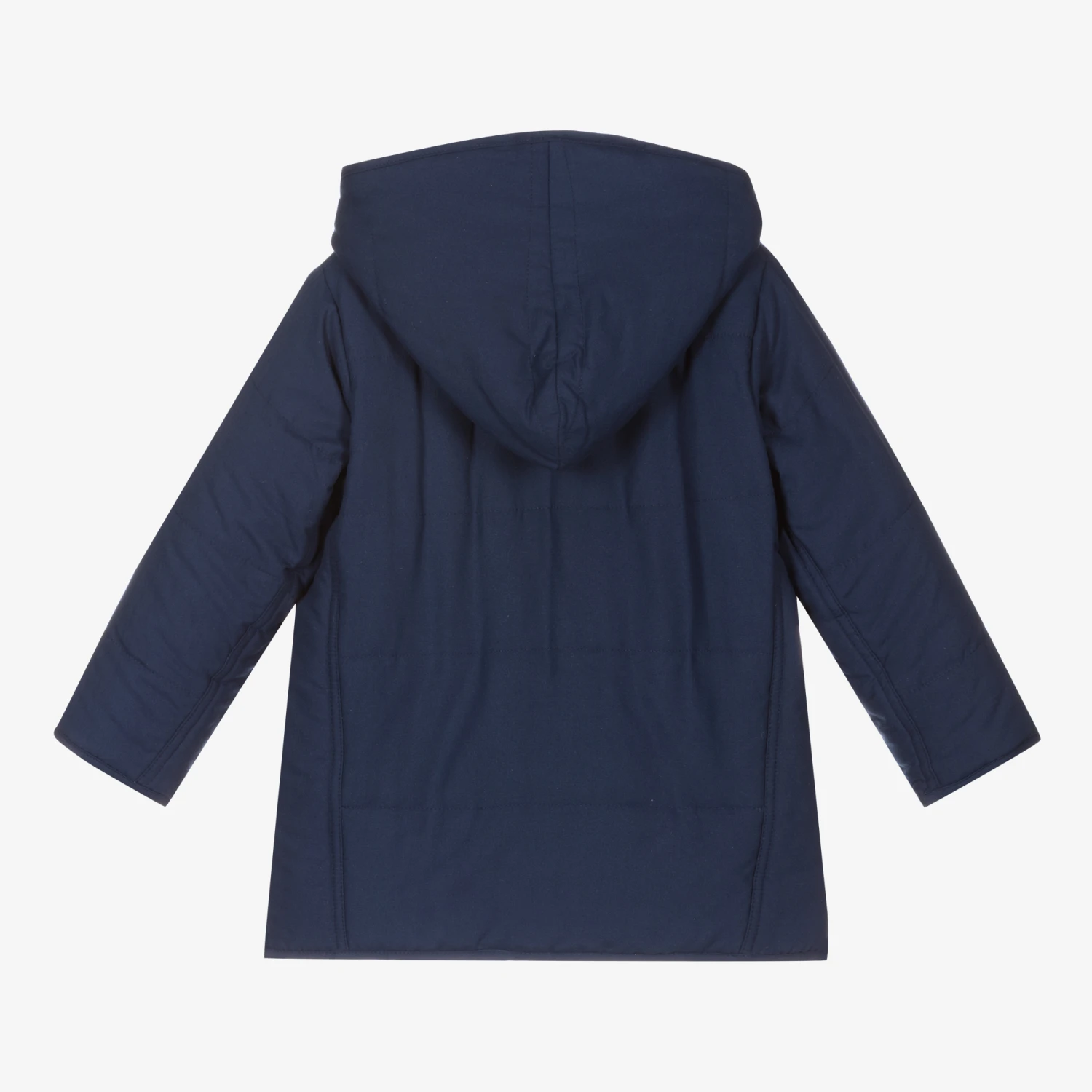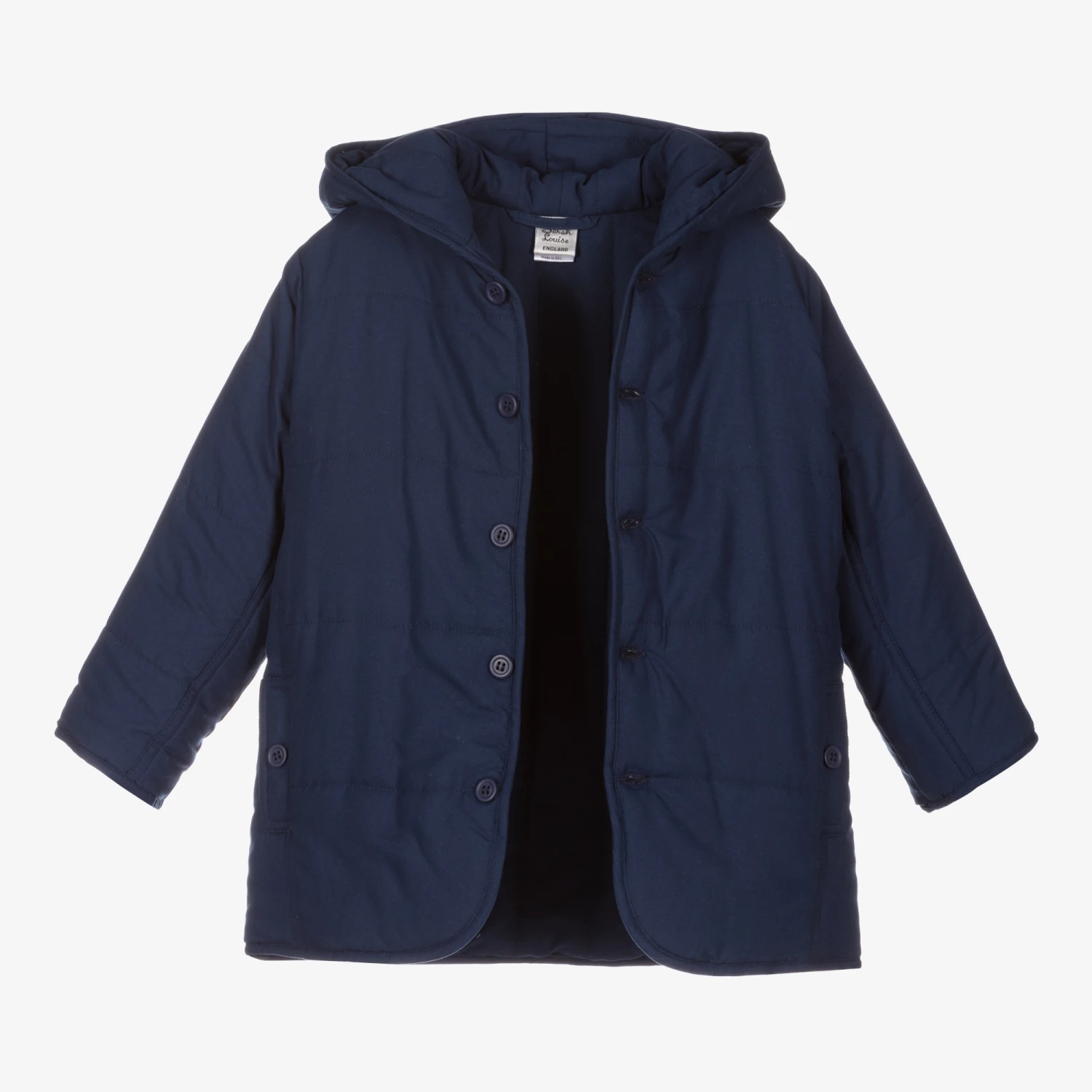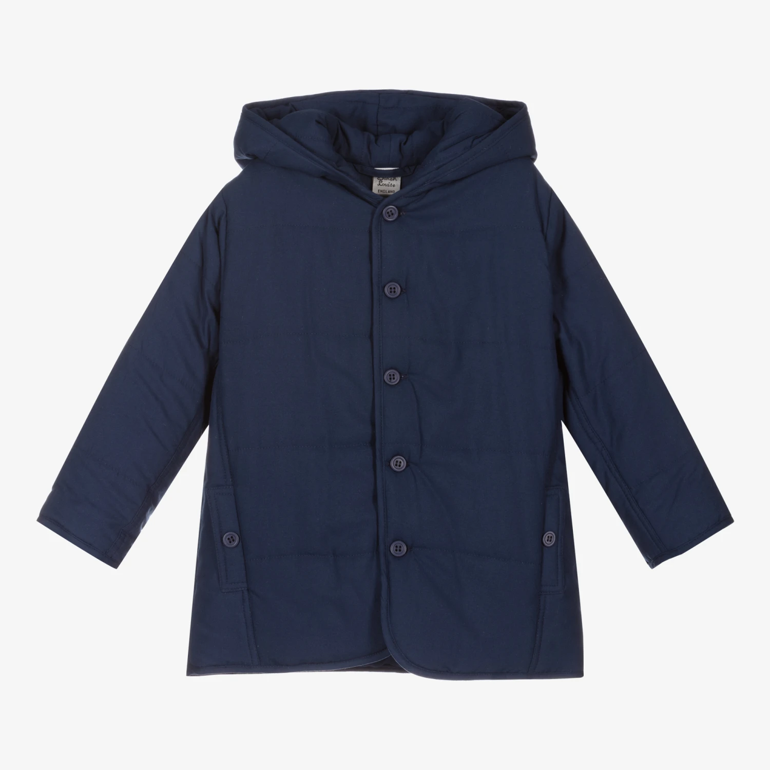 Navy blue hooded coat for younger boys and girls by Sarah Louise. Made in soft polyester, it has lightweight padding, button fastenings and button-fastening hand pockets.