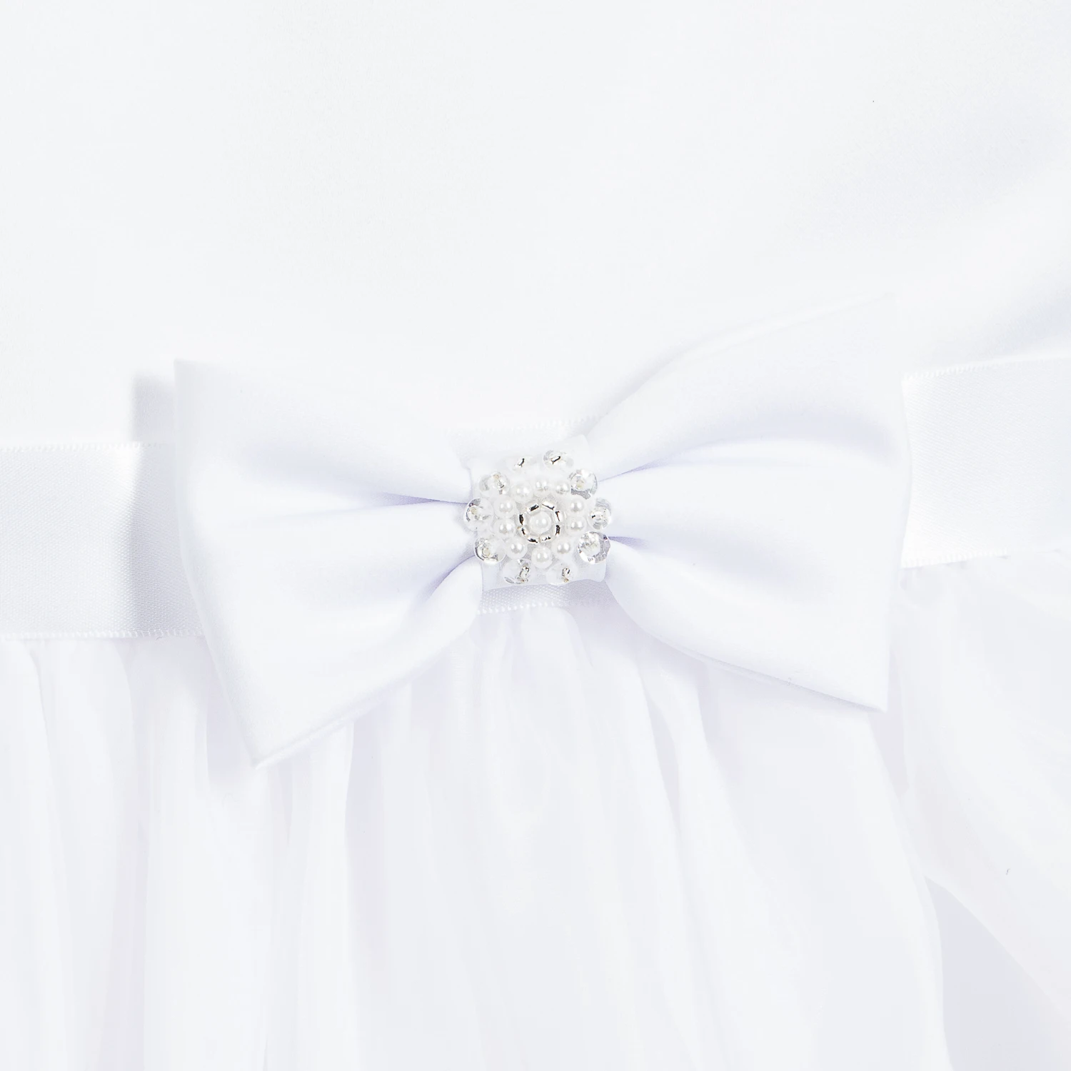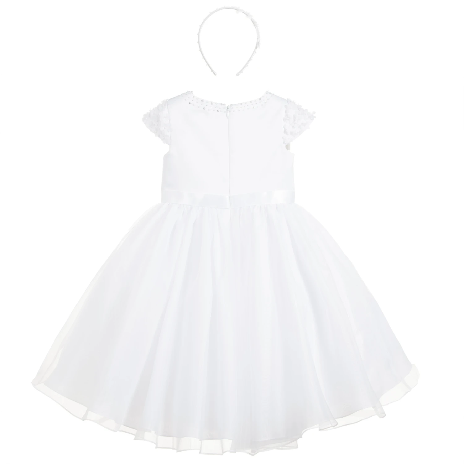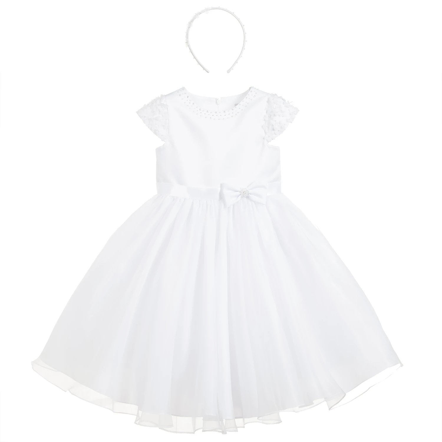 A gorgeous white dress and matching headband for girls, from Sarah Louise. Trimmed with pearl and crystal beads, delicate fabric flowers and a satin ribbon bow, it is made from silky-soft satin, with an organza overlay on the skirt. The full lining has a tulle frill to add volume.Â