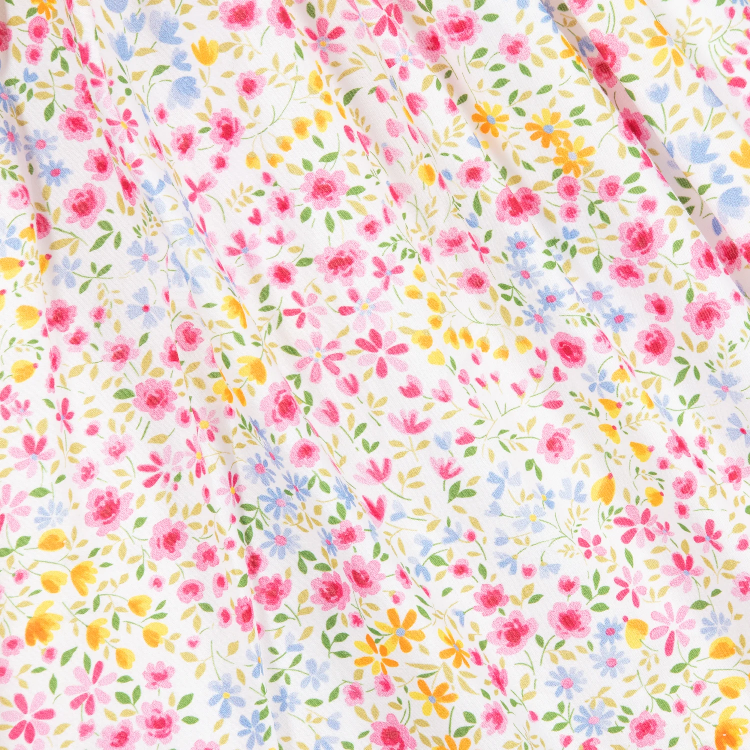 Girls sleeveless dress by Sarah Louise, with a pretty floral print in pink, blue and yellow on a white background. The bodice has beautiful hand-smocking with hand-embroidery in pink and blue. Made and lined in lightweight polycotton, it has frilled trim on the collar and a sash tie on the back.