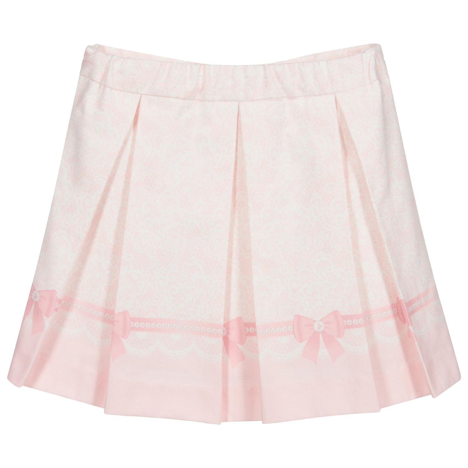 Pink and white skirt for girls by Sarah Louise, made in soft polycotton, with a lightweight lining. This pleated skirt is patterned with a lacy print, with a bow and pearl print around the hem. It has a fixed bow trim on the waistband, a side zip and useful adjustable waist.