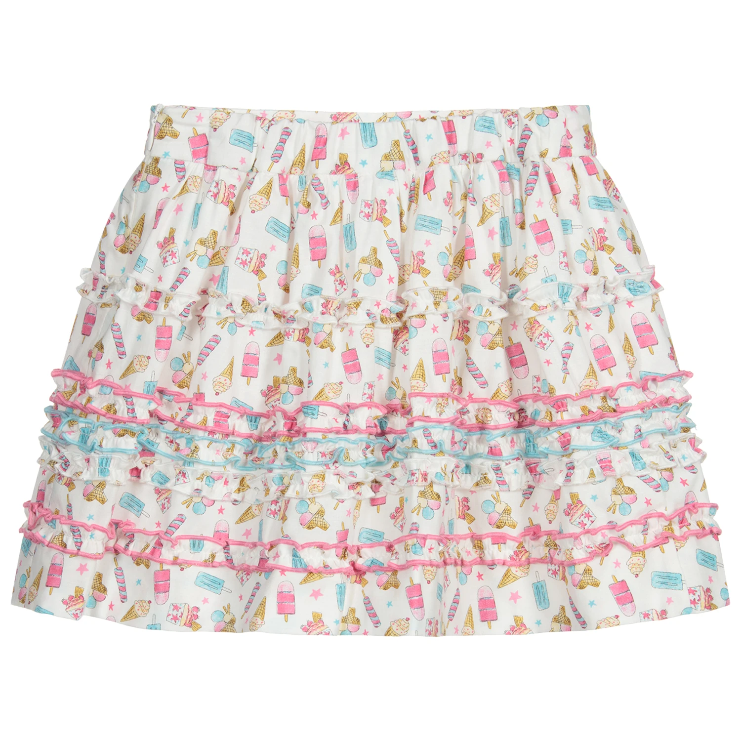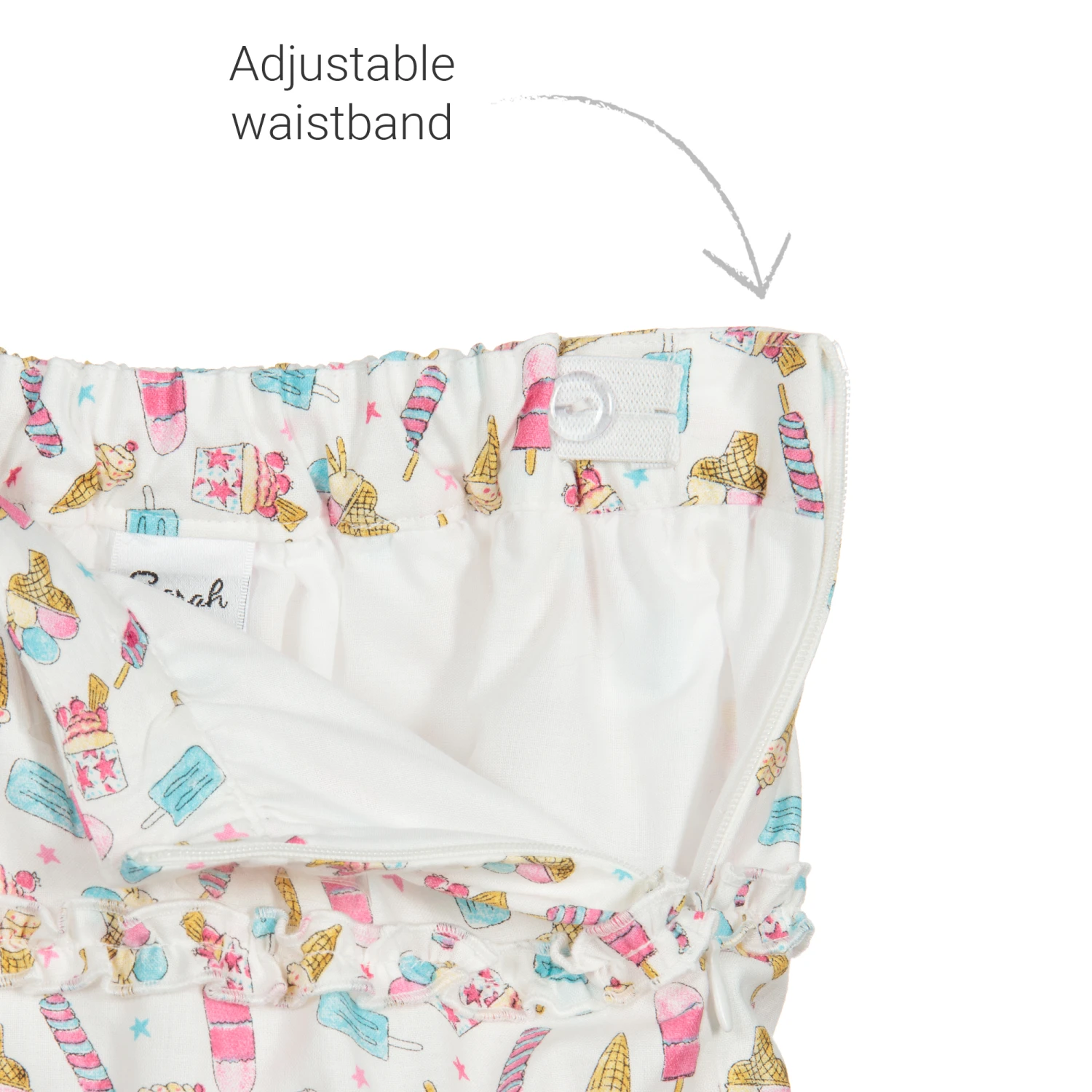 White and pink printed skirt by Sarah Louise, made in soft, lightweight polycotton, with a colourful ice cream and ice lolly print. It has ruffle trims, with pink and blue edging and a blue and pink ribbon bow, with sparkly pink heart shaped button at the waist.