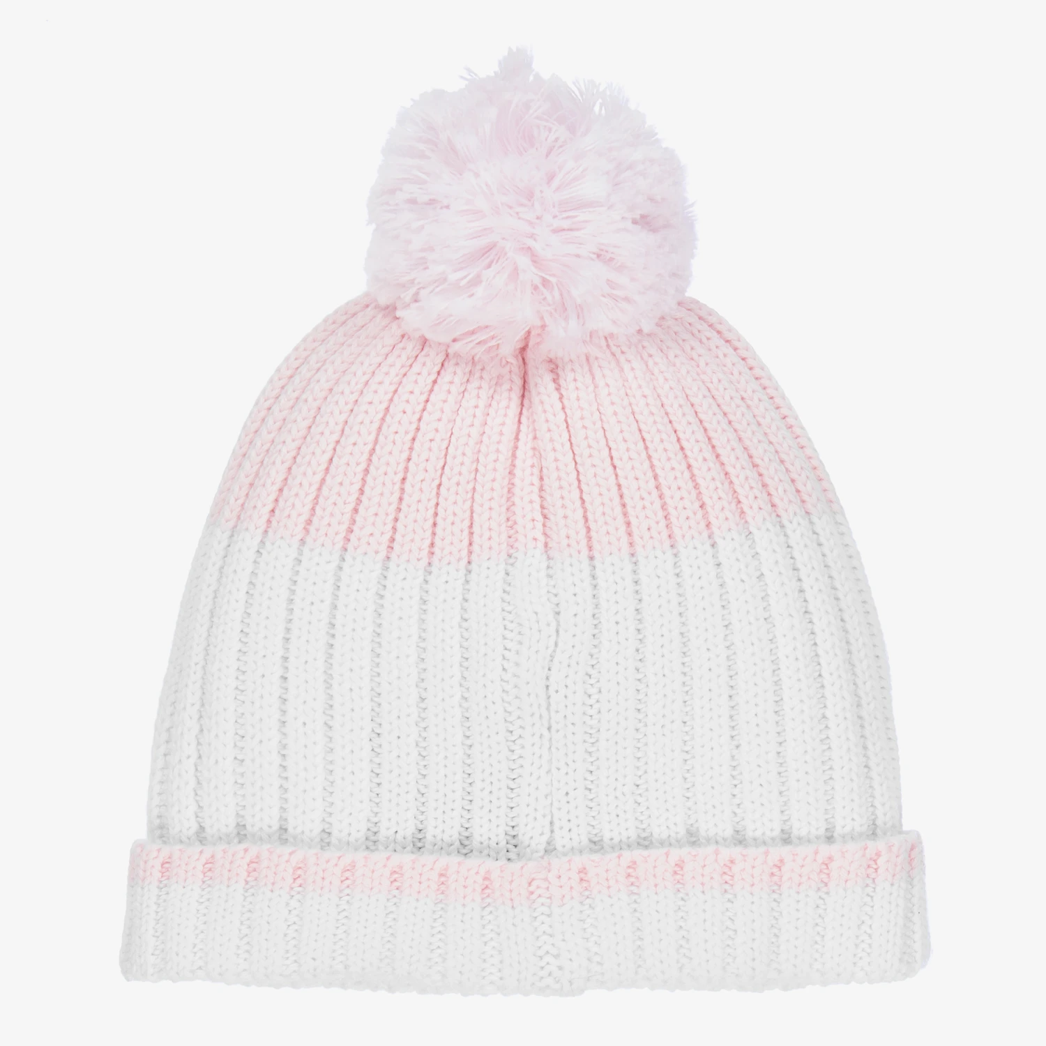 Pink and white hat for baby girls by Sarah Louise, in a ribbed cotton knit. It has a turned up brim and a fluffy pom-pom on top.