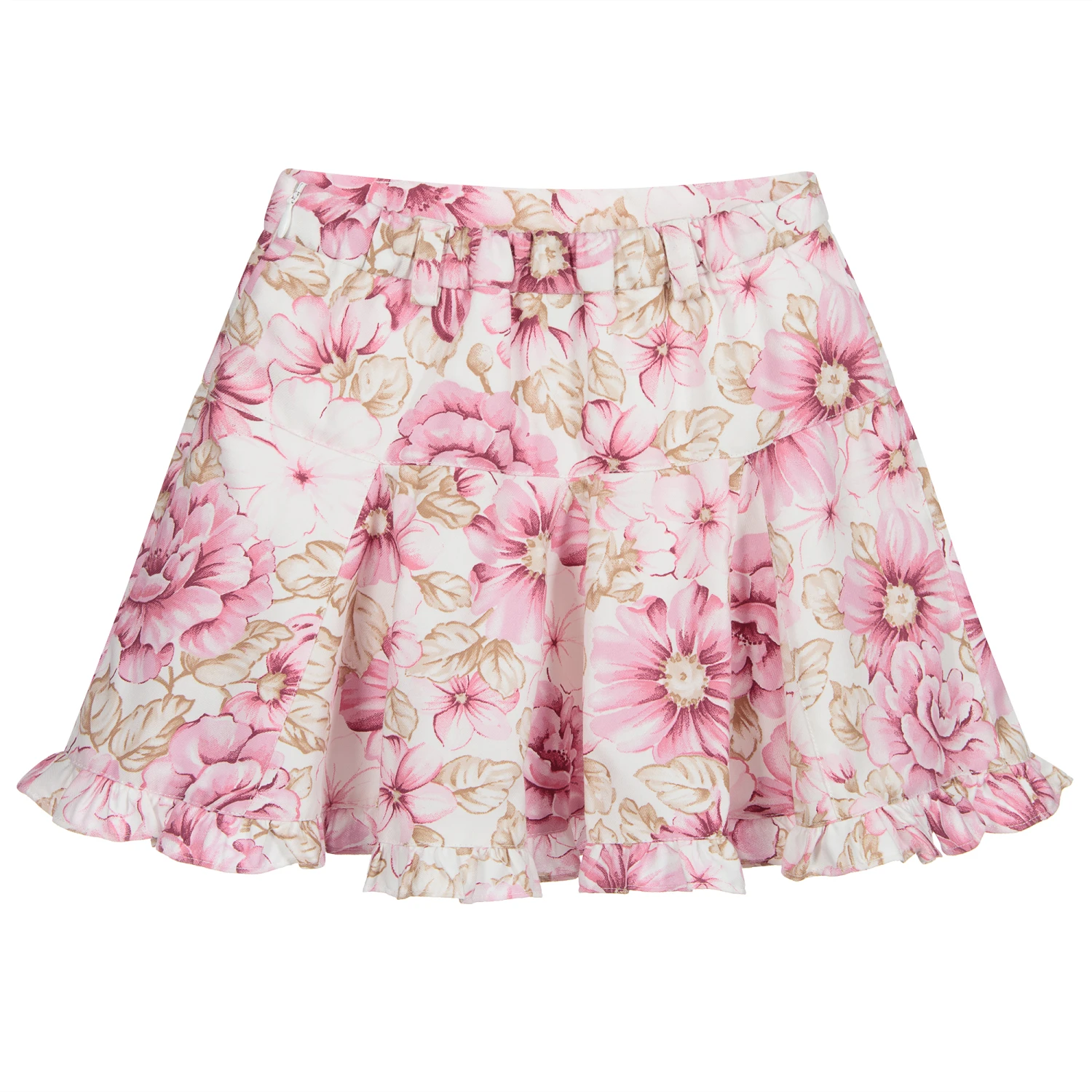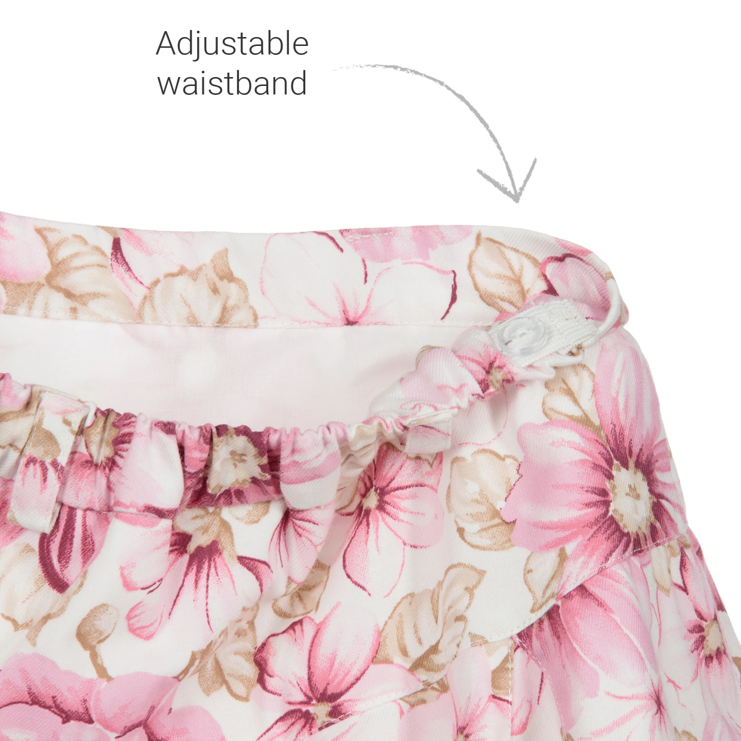 White skirt for girls by Sarah Louise, made in soft polycotton, with a pink and beige floral print. Lightly pleated, it has a frilled hem, with pink and beige bow trims on the front with glittery pink heart shaped buttons. There is a side zip and useful adjustable waist.