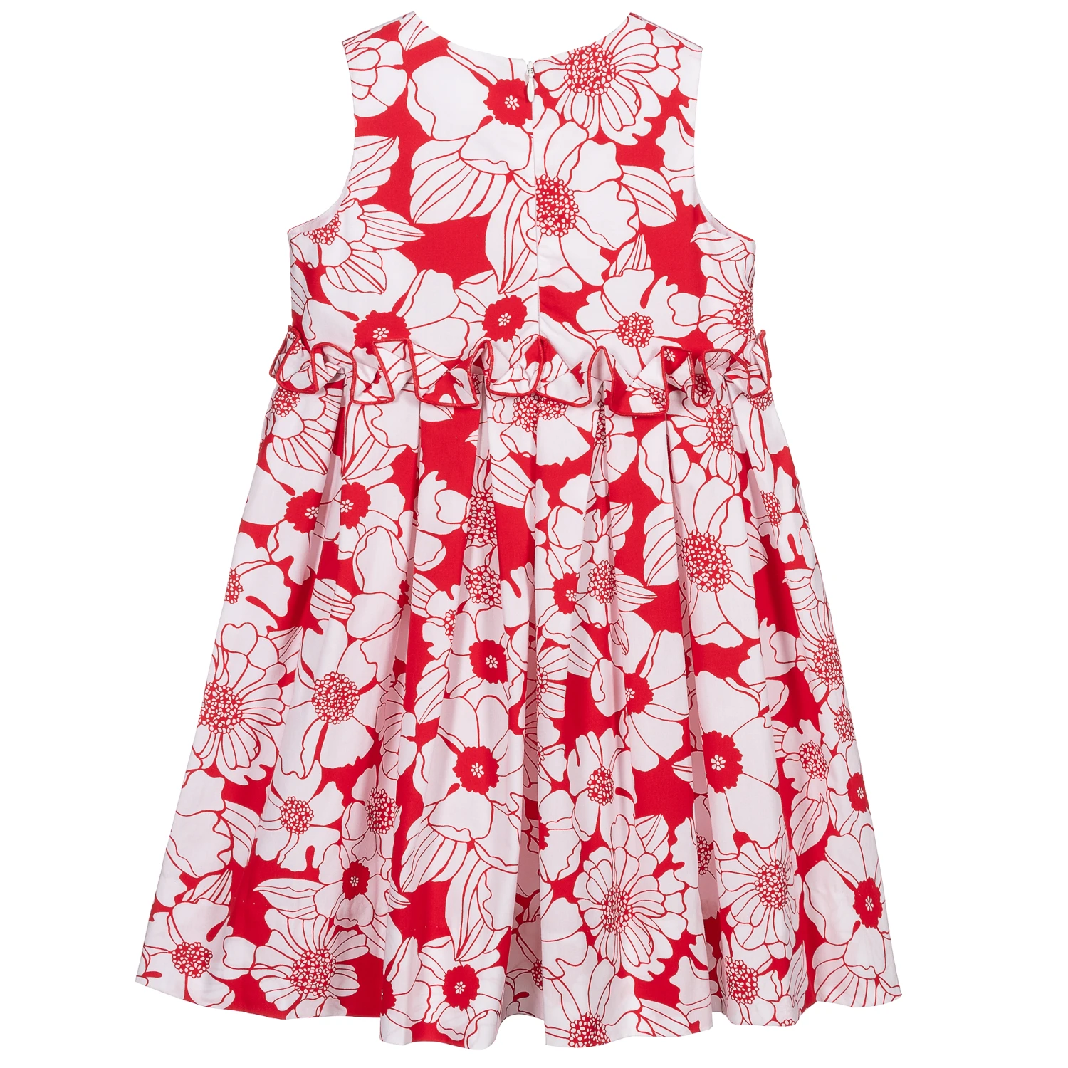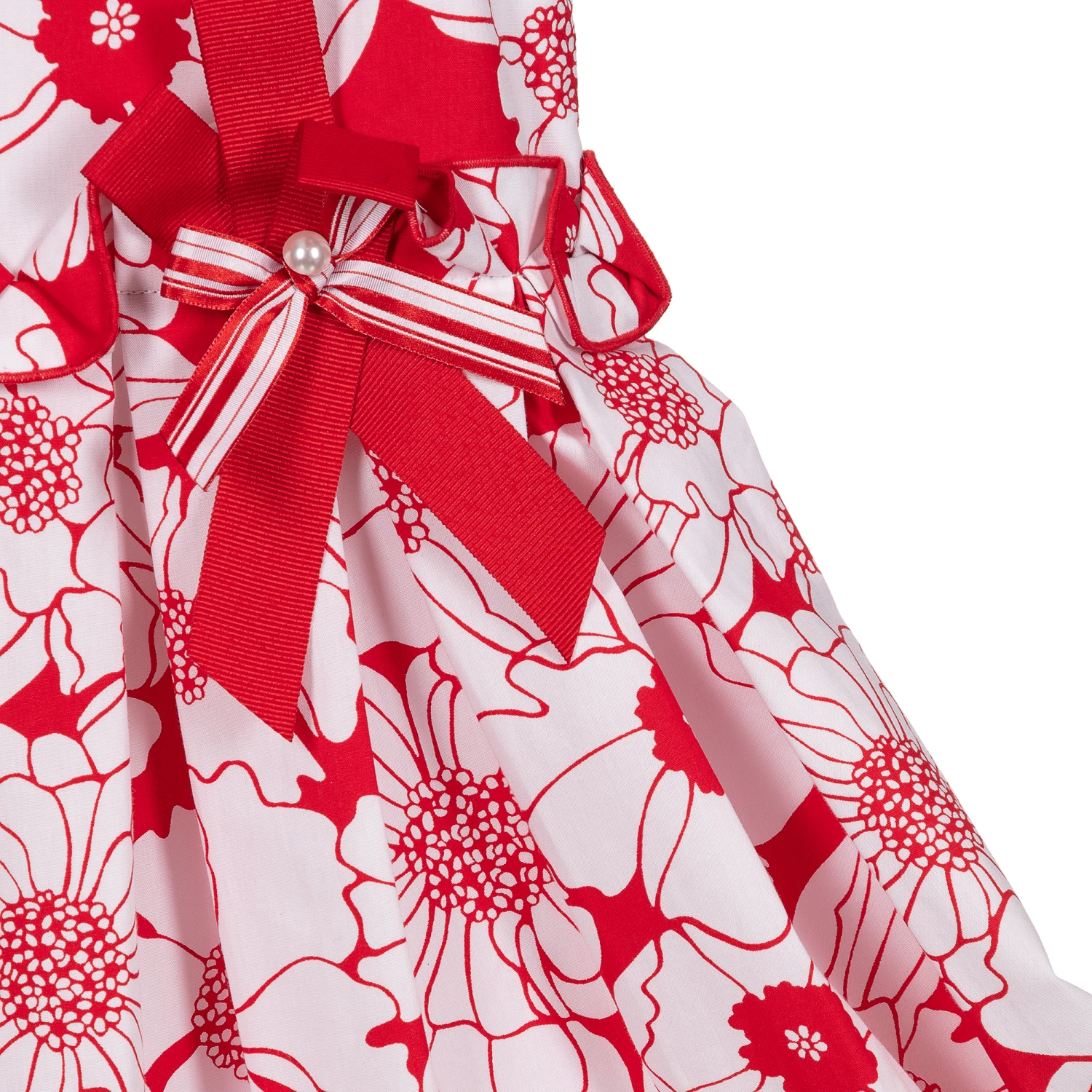 A lovely red and white floral-patterned dress for girls by Sarah Louise, made in a soft cotton blend. The waistband has ruffle trim and a fixed ribbon bow decoration with a pearl bead centre. The dress is fully lined and fastens with a concealed zip on the back.