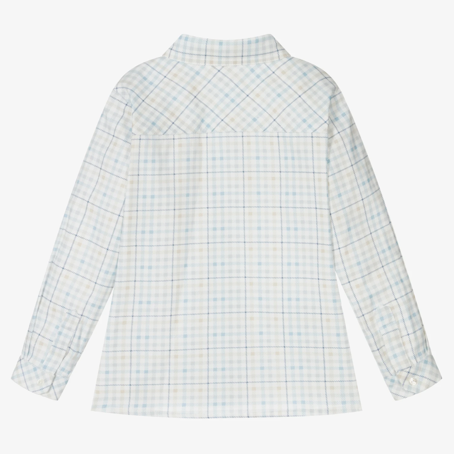 White, blue and beige checked shirt for boys by Sarah Louise. Made in soft cotton-blend twill, it has chest pockets and button fastenings.