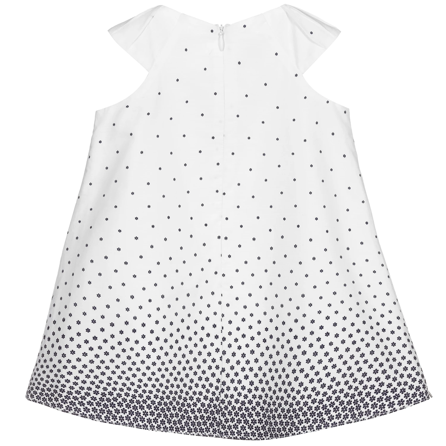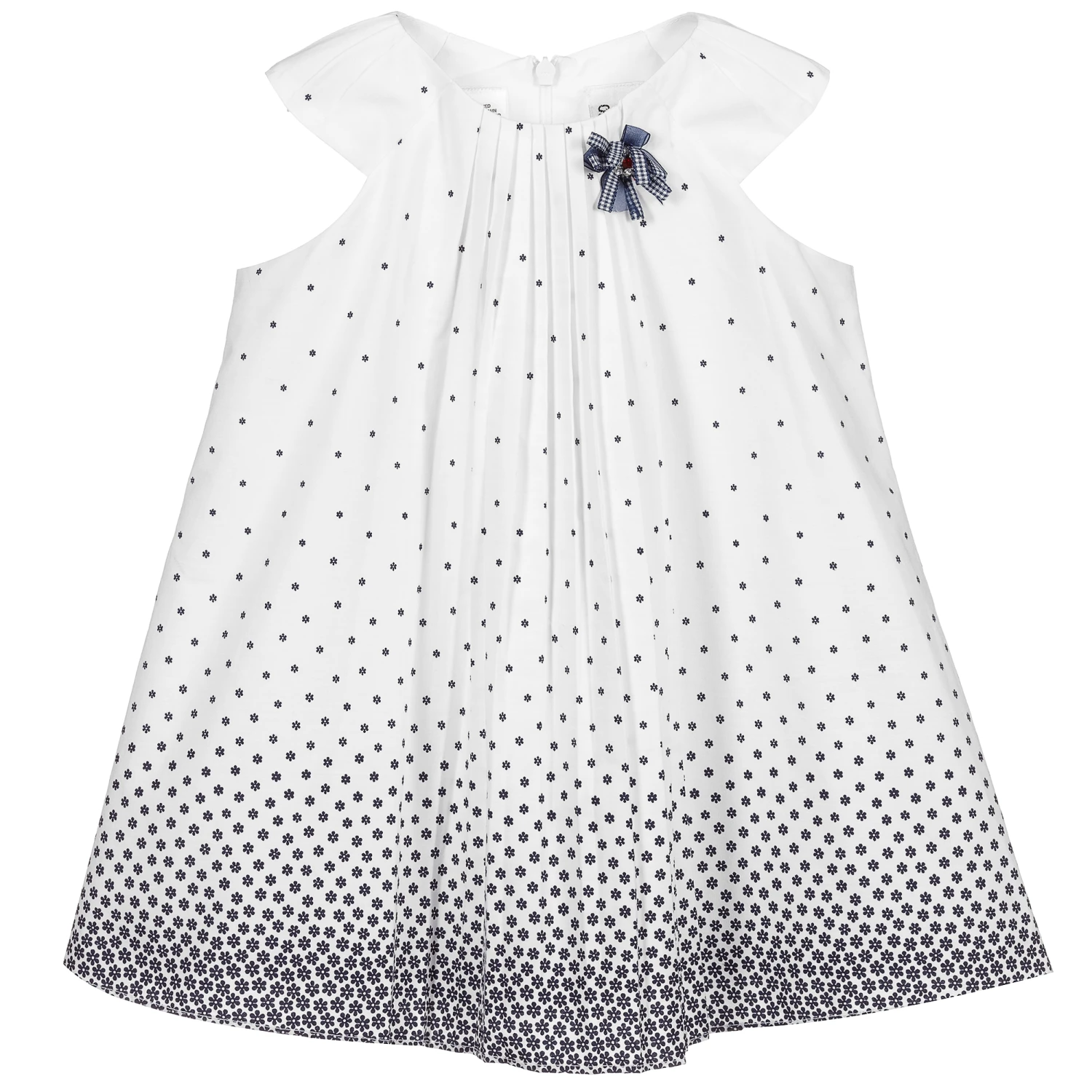 A lovely white dress for little girls by Sarah Louise, made in a soft cotton blend. It is pleated on the front and has a pretty navy blue floral pattern. There is a checked bow decoration on the chest, trimmed with sparkling diamanté.