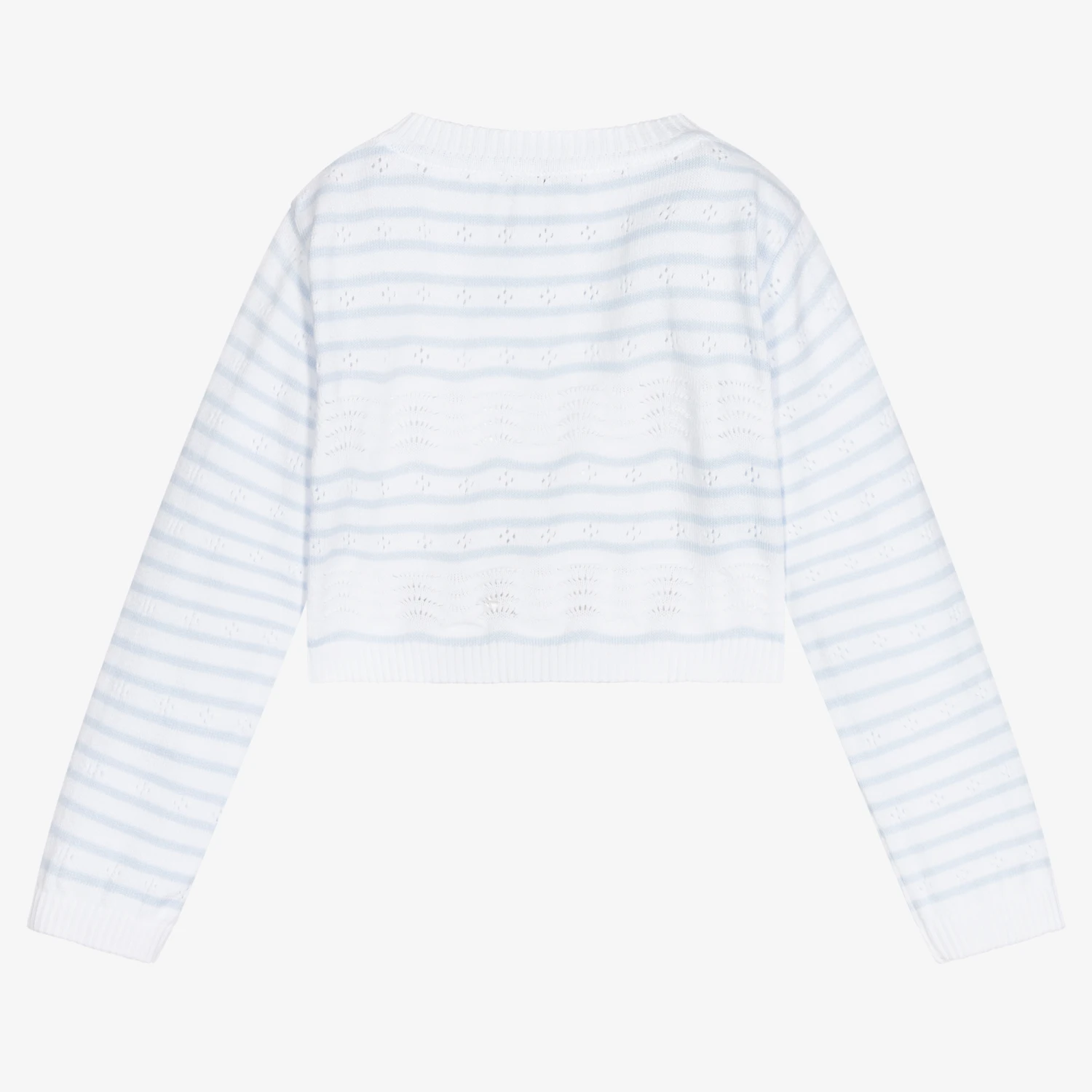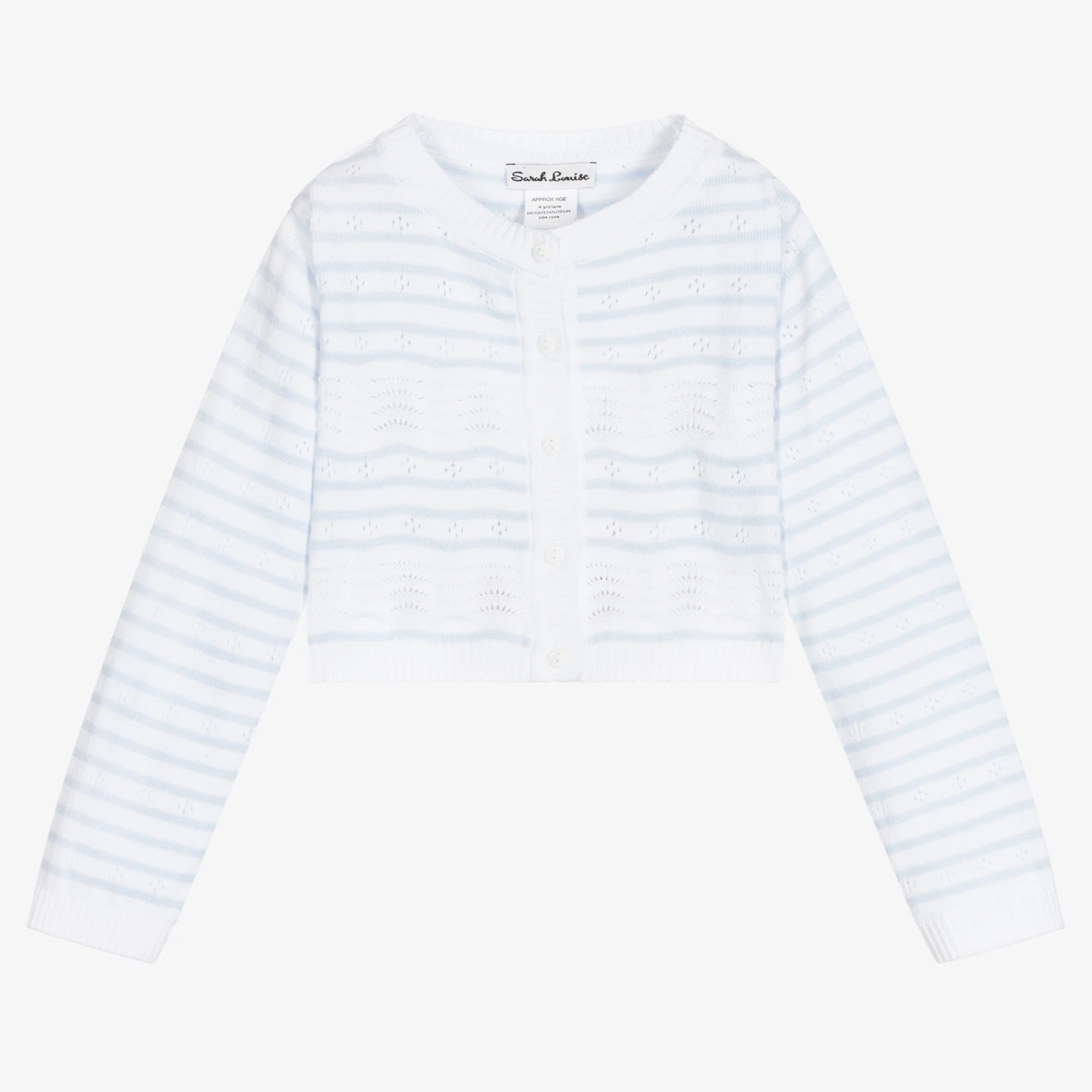 Blue and white striped cardigan for little girls by Sarah Louise. It is finely knitted in soft cotton with pretty patterned detailing.