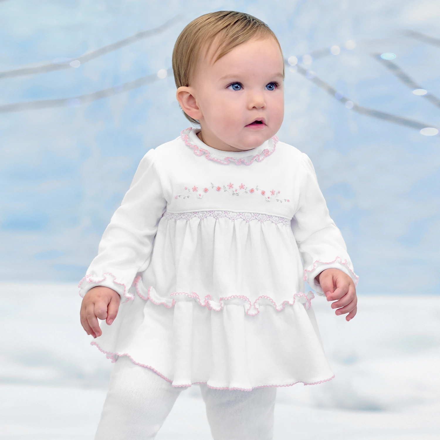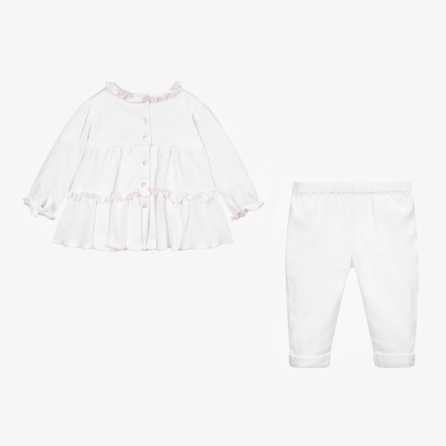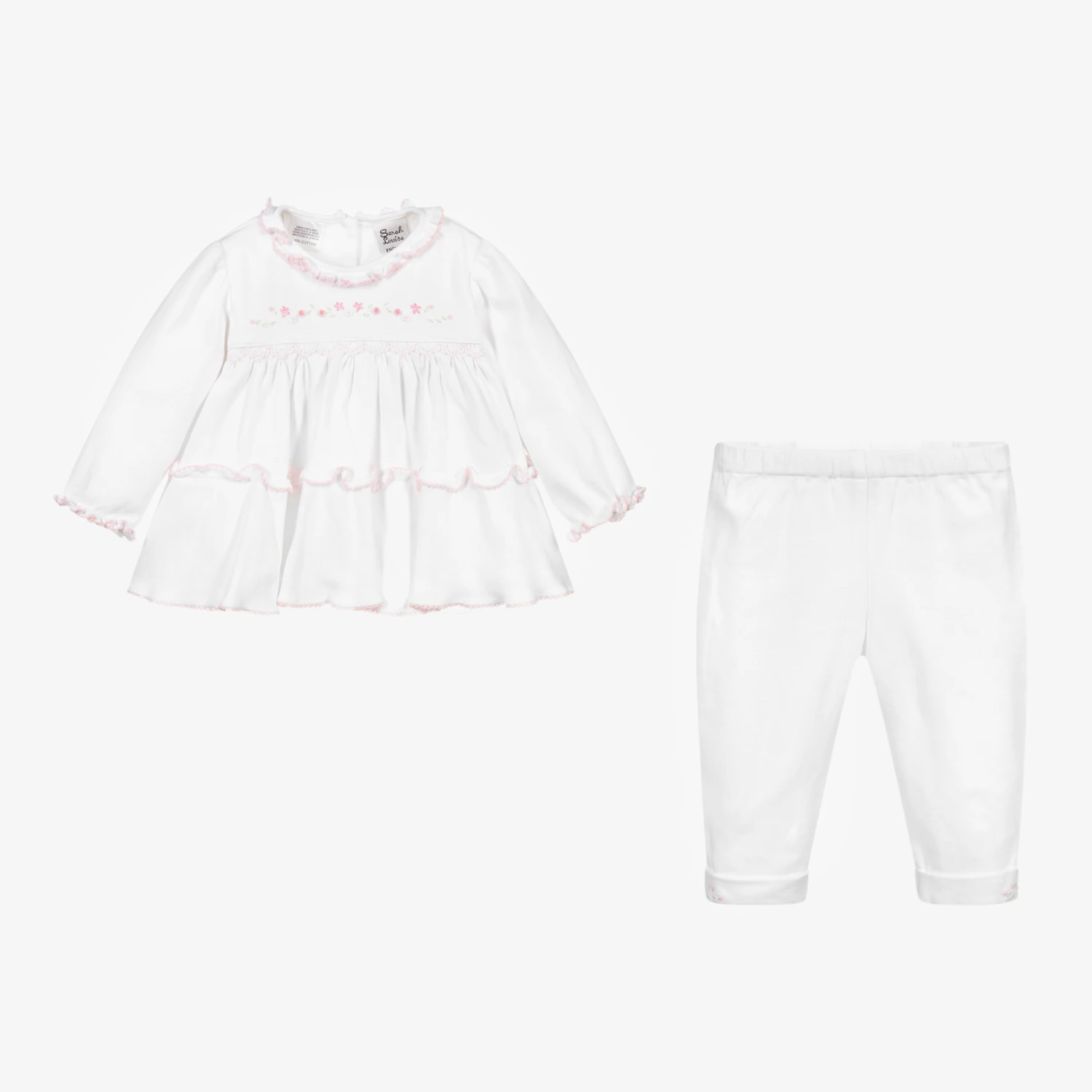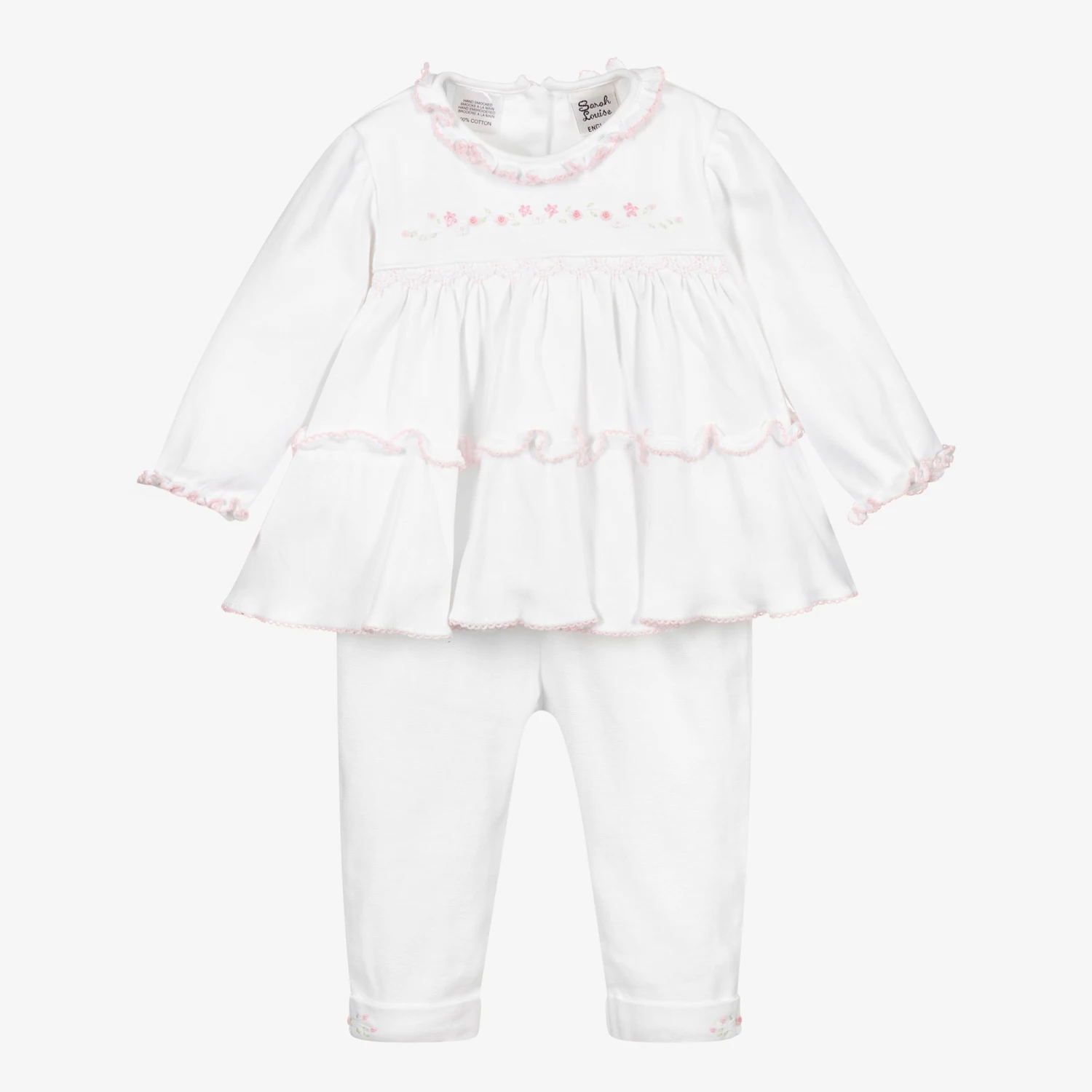 White trouser set for girls by Sarah Louise. Made from soft cotton jersey, it has a pretty pale pink hand-smocked detail on the front, pink hand-embroidered flowers, and a pink trimmed ruffle collar. The matching white trousers have sweet hand-embroidered pink flowers on the cuffs and a gently elasticated waistband.