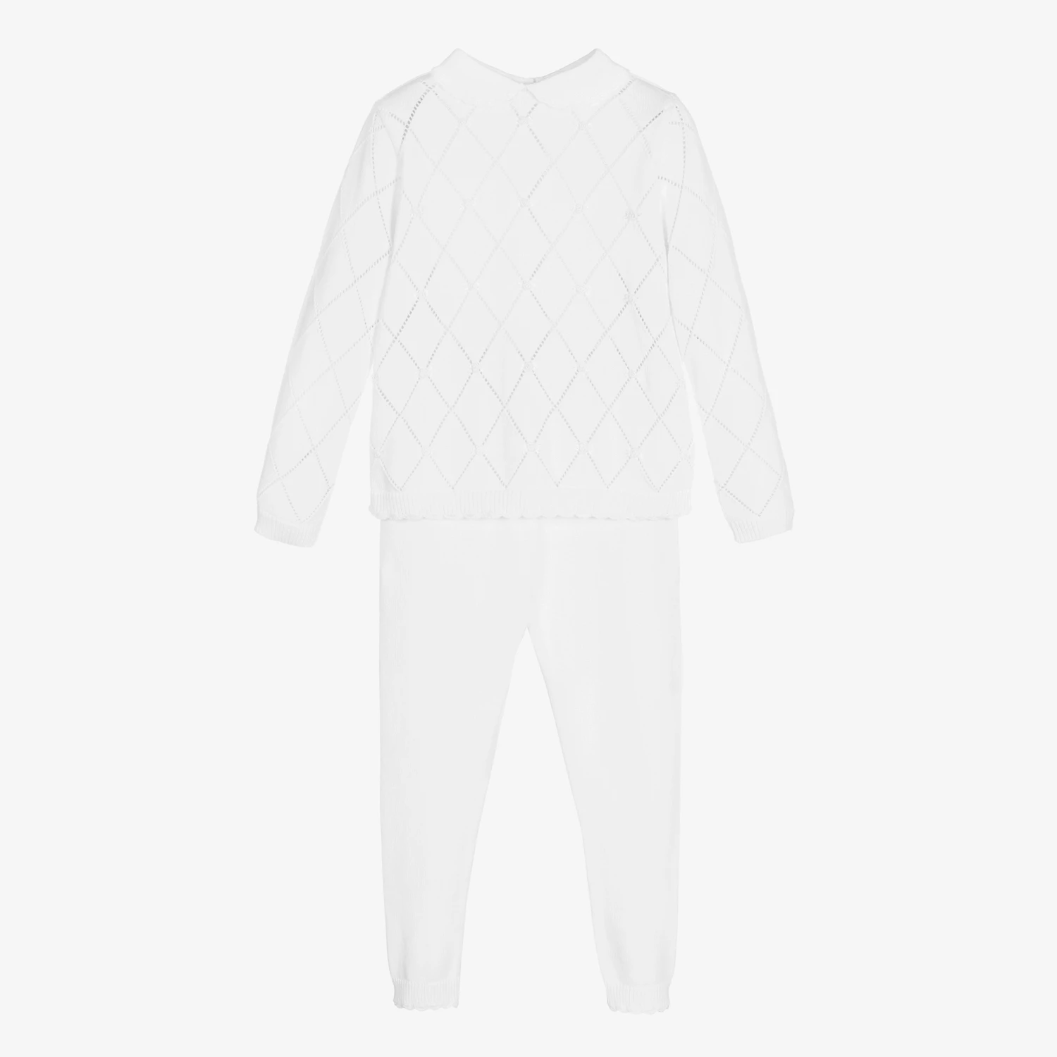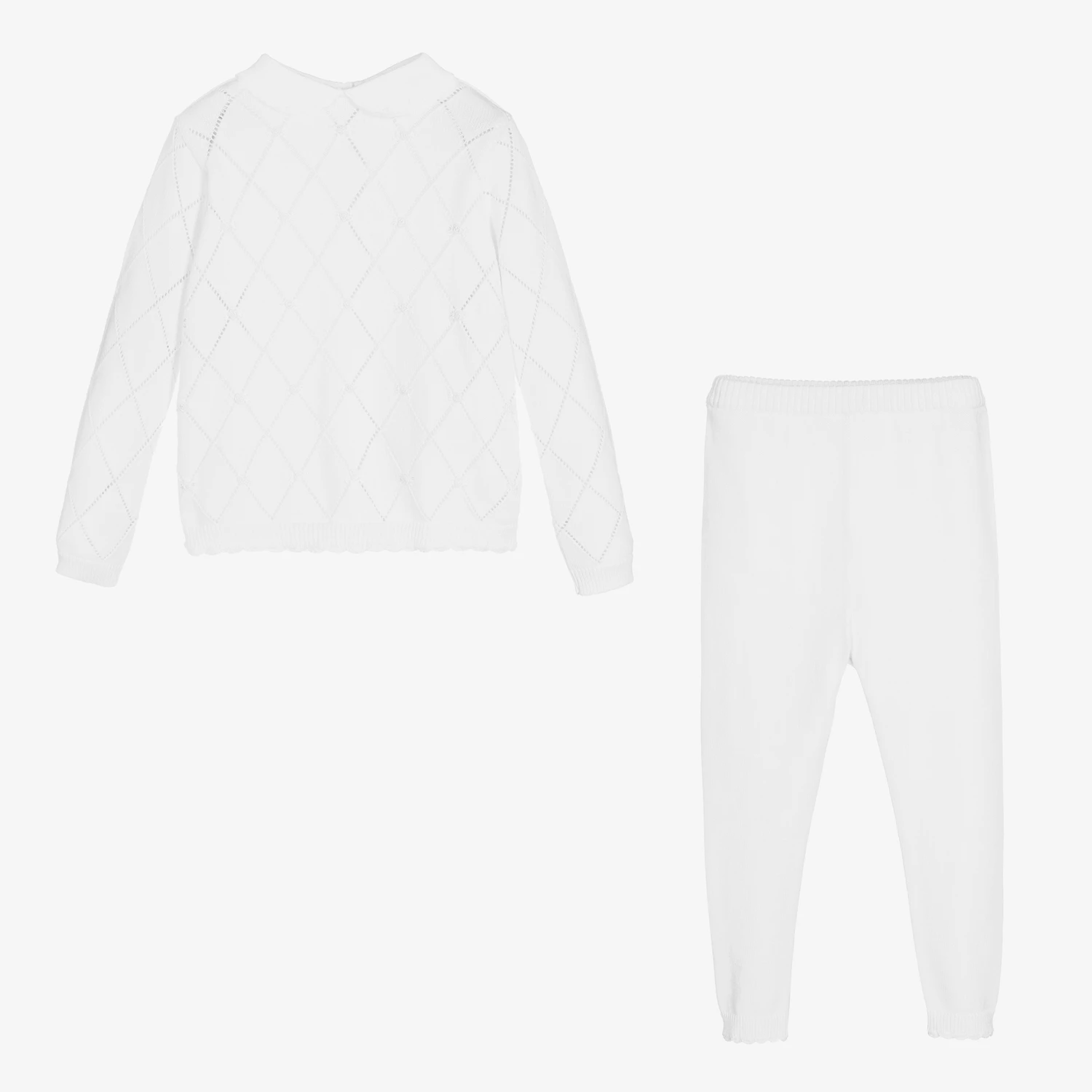White trouser set for little girls by Sarah Louise, knitted in soft cotton. The top has a diamond-shaped pattern, with pretty embroidered roses on the front. The top has back button fastenings and the trousers have a comfortable elasticated waistband.