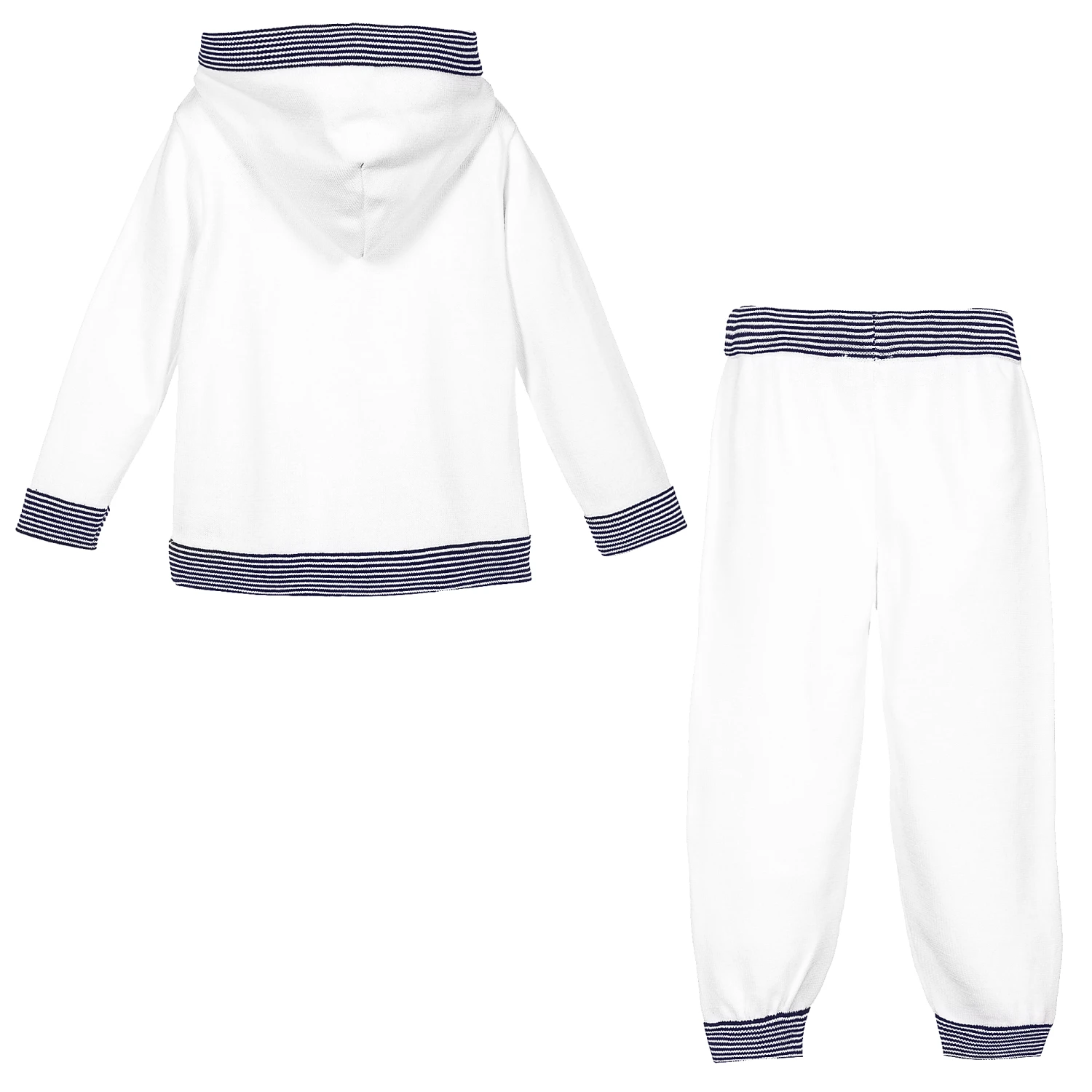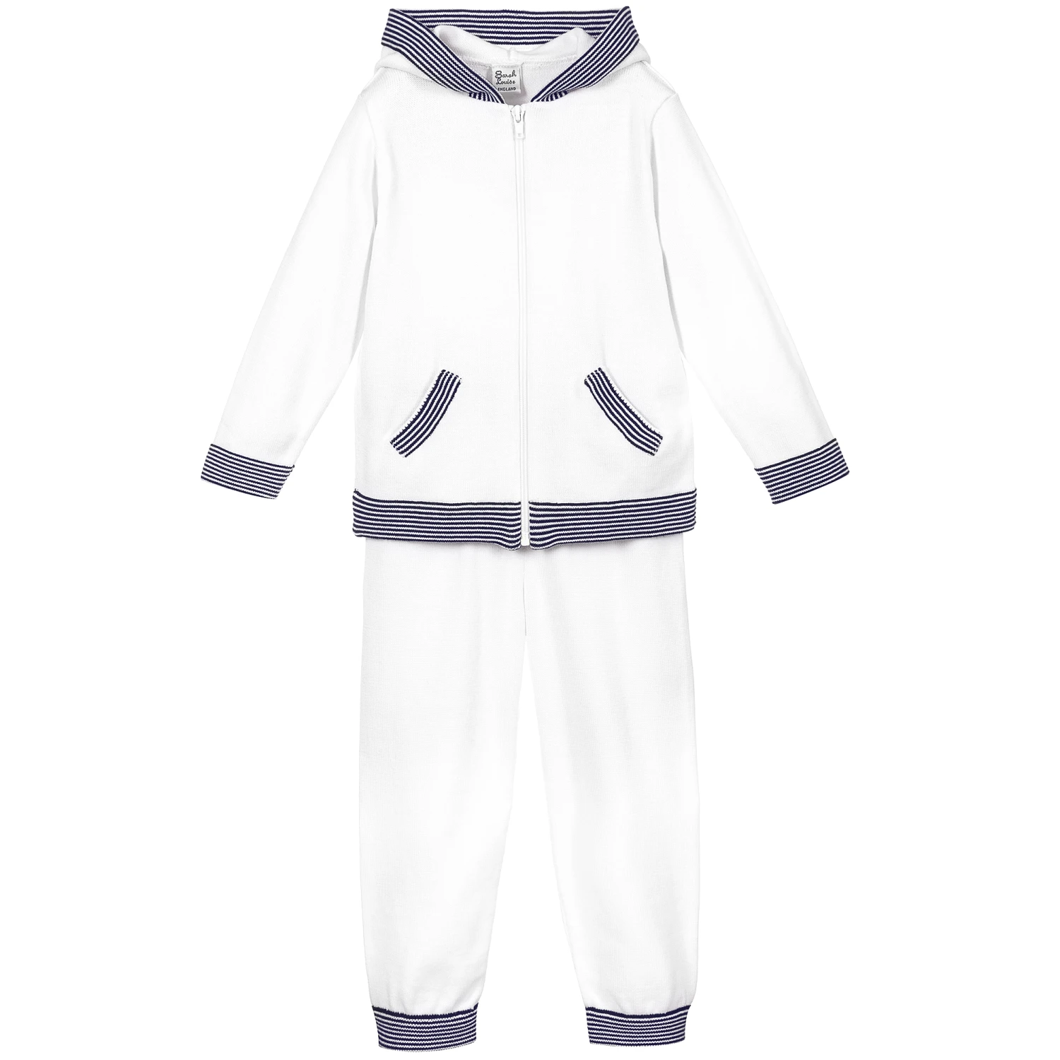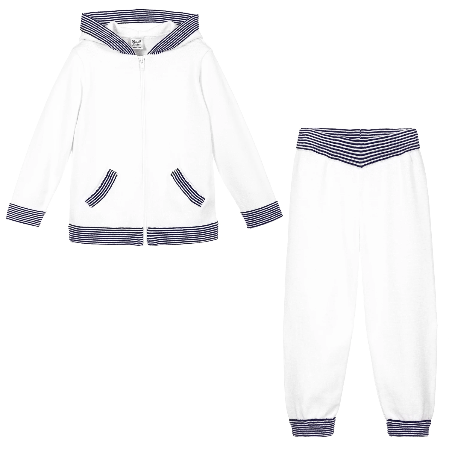 White trousers set for little boys by Sarah Louise. It is knitted in soft cotton and has navy blue striped trims. The hooded top has pockets and a front zip fastening, and the trousers have a comfortable elasticated waist.