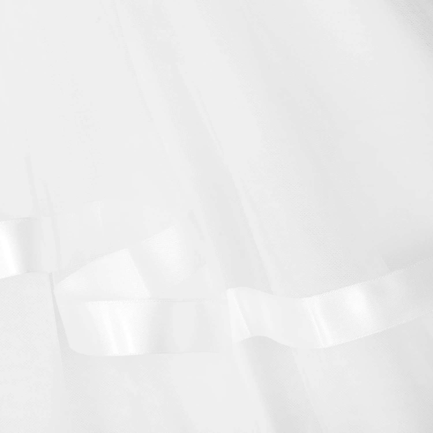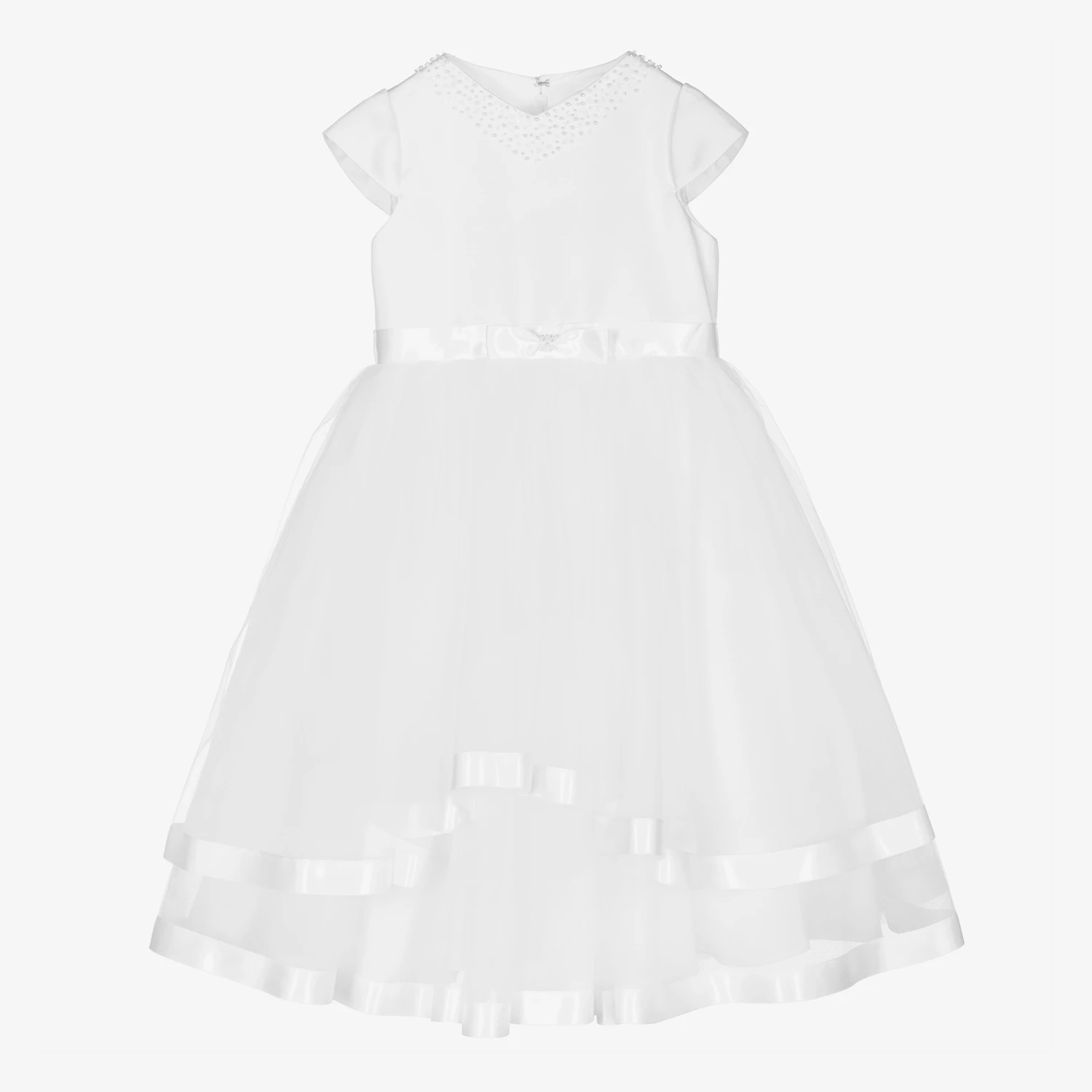 Beautiful for a special occasion, this white dress for girls is by Sarah Louise. The bodice is made in silky satin and decorated with sparkly beads. There are elegant faux buttons on the back, with a concealed zip fastening beneath. Made in layers of soft tulle, the full skirt has a silky underskirt and lining, with stiff tulle trim for added volume. There is pretty satin ribbon trim around the waist and along the hem.