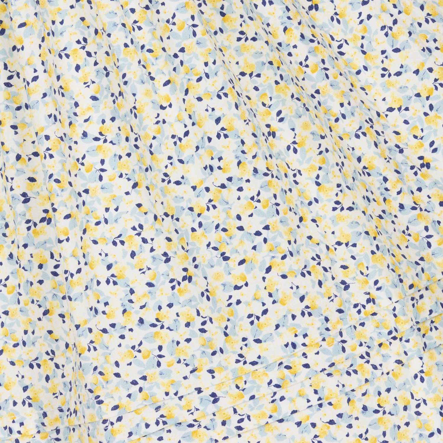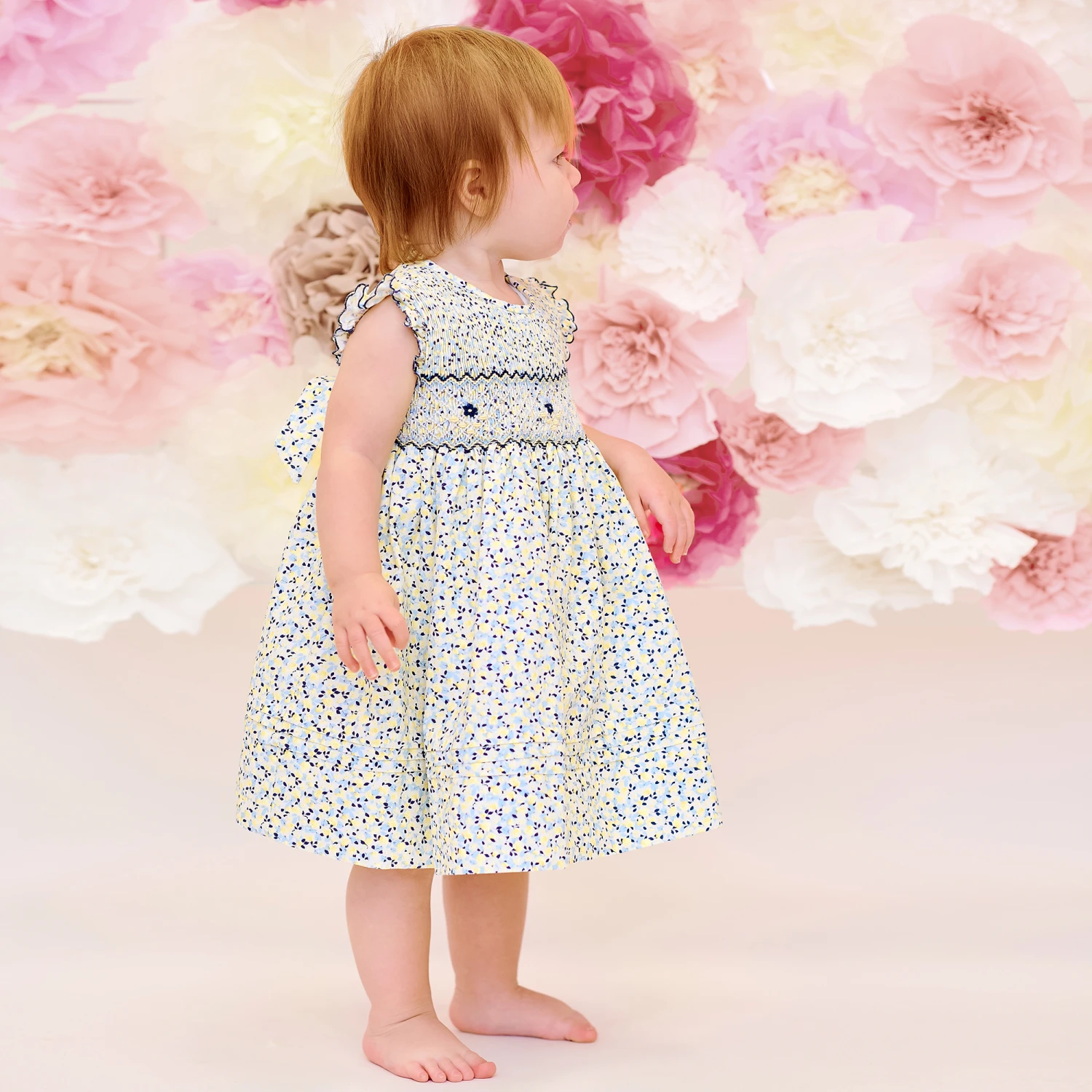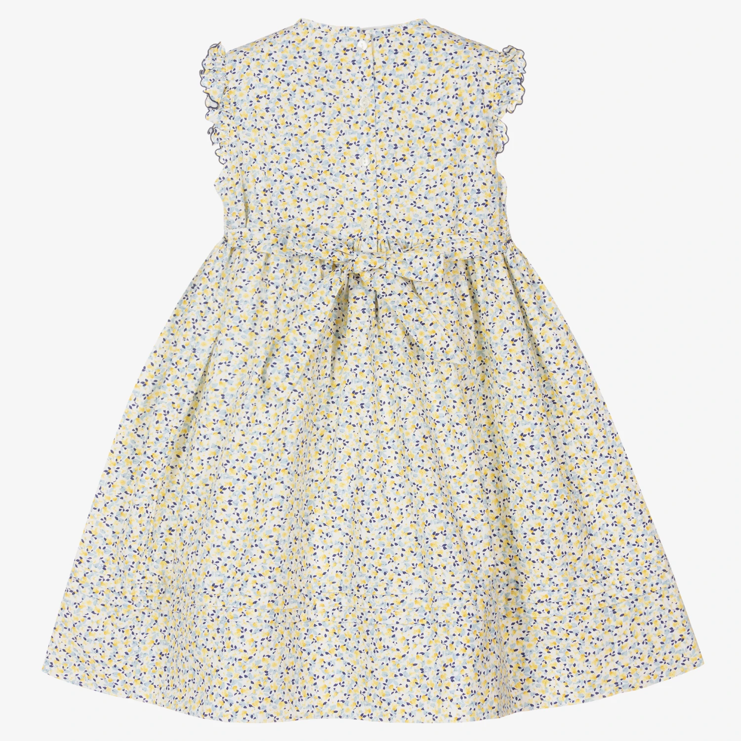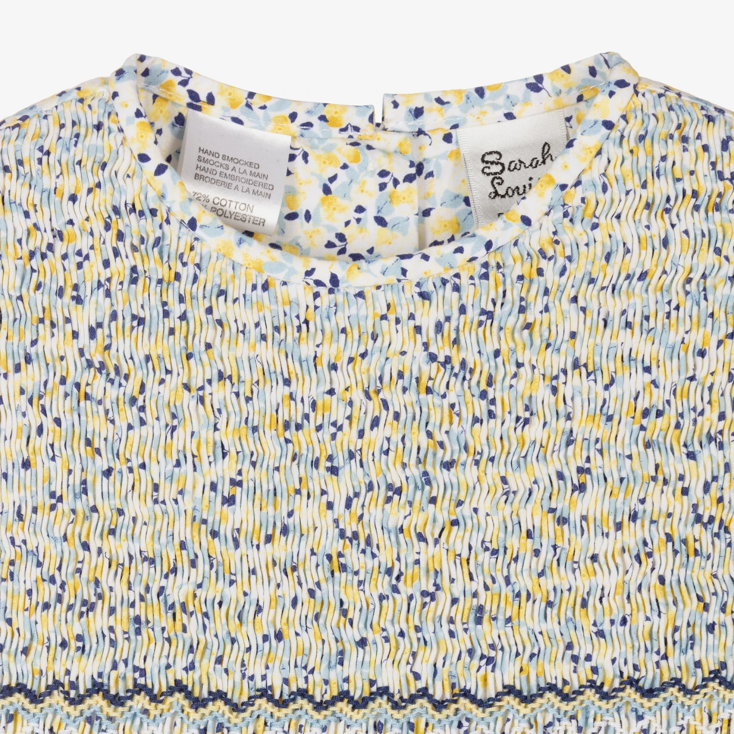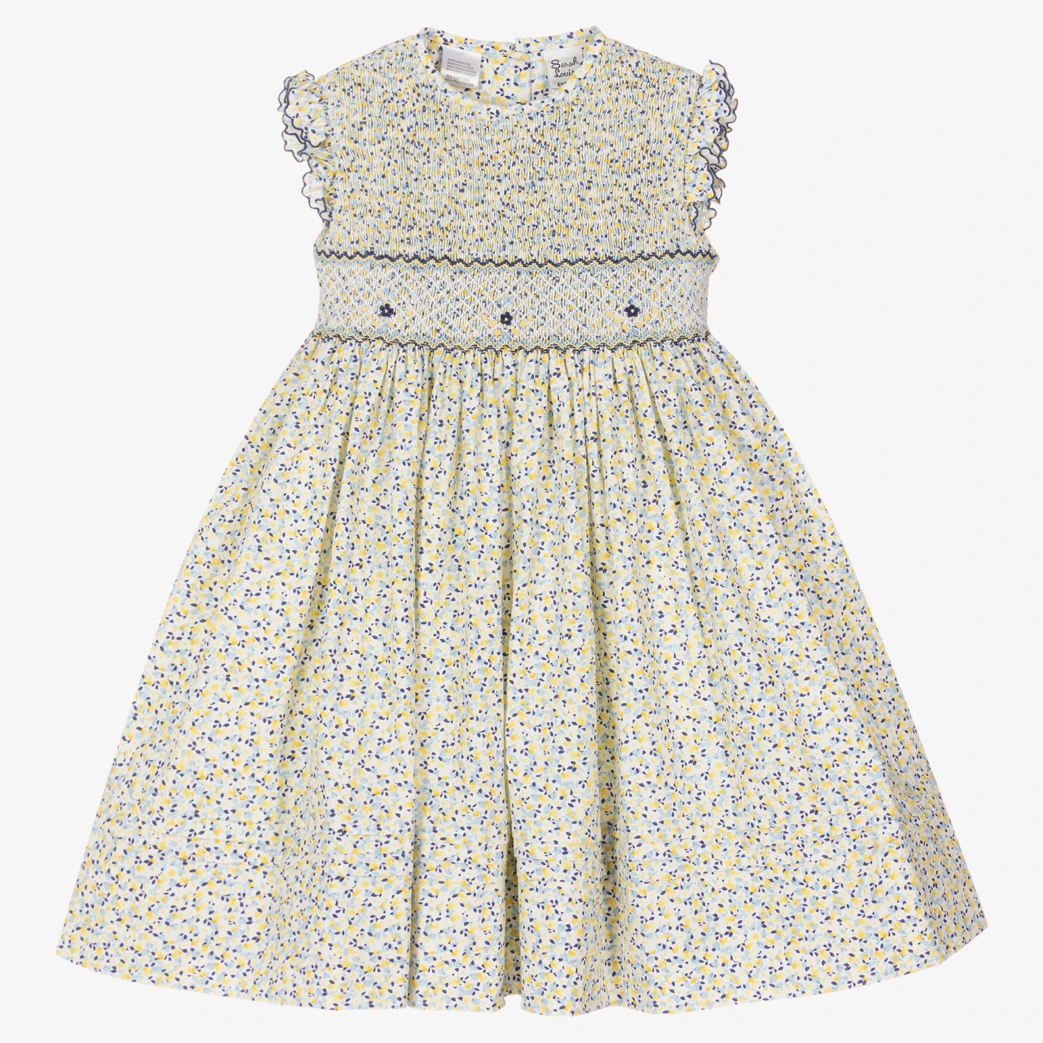 Girls lovely cotton poplin dress from Sarah Louise, in a yellow and blue floral print over a white background. The front of the bodice is beautifully hand-smocked and hand-embroidered with pretty, scallop-edged frills over the shoulder. Lined with lightweight voile for comfort, it has a sash to tie and buttons to fasten on the back.